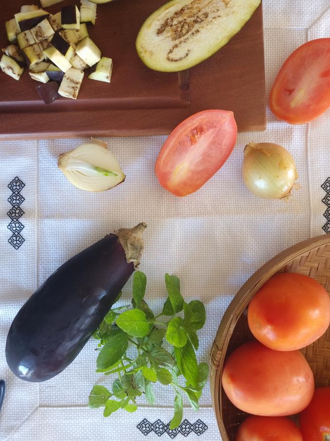 Coloque óleo vegetal em uma frigideira, mais ou menos 1cm. Quando estiver quente, frite os cubos de berinjela. Se eles ficarem muito apertados, faça em duas etapas. Deixe-os fritando até ficarem bem macias quando espetadas com um garfo. Transfira-os para um prato forrado com papel absorvente.